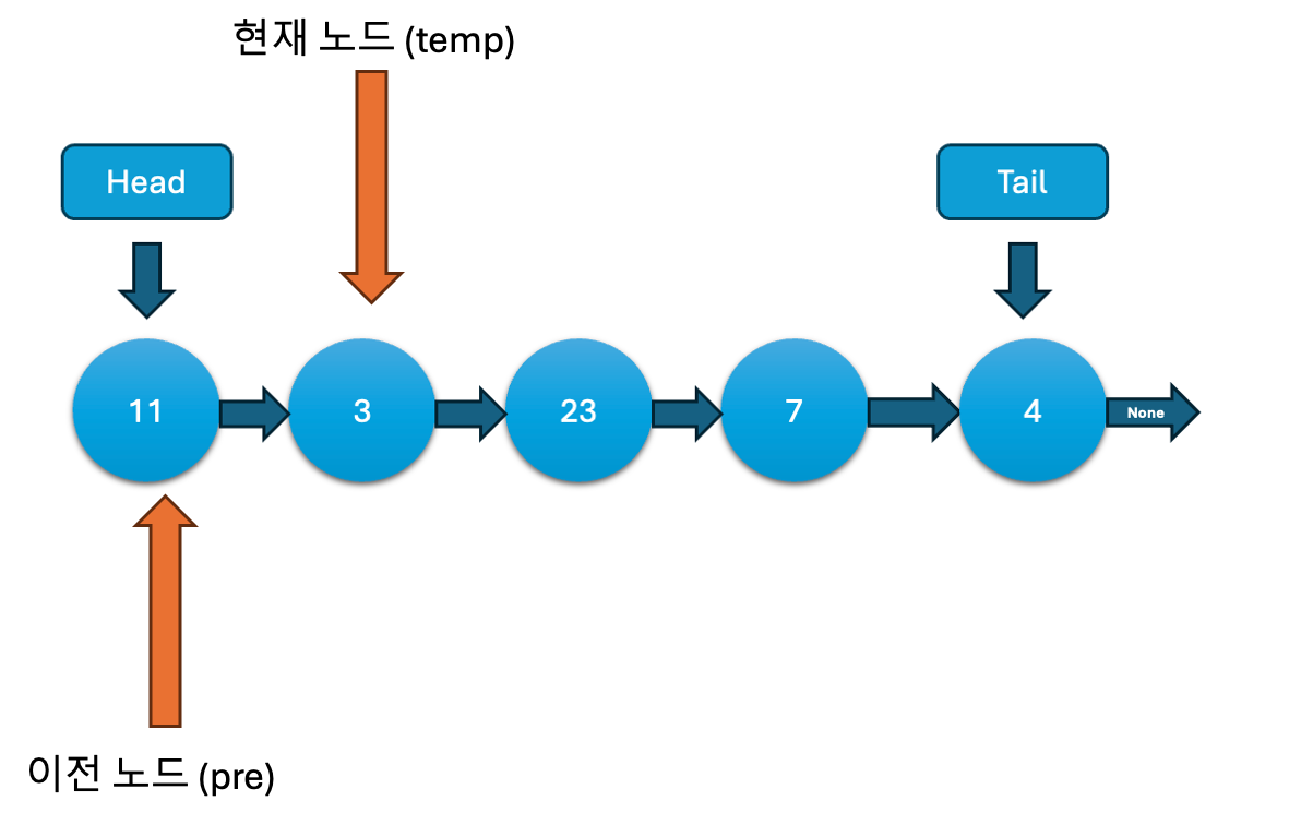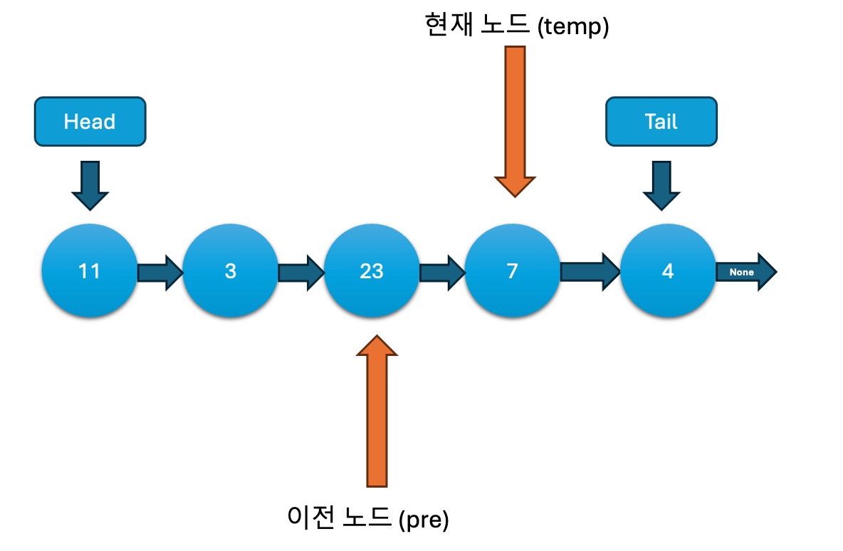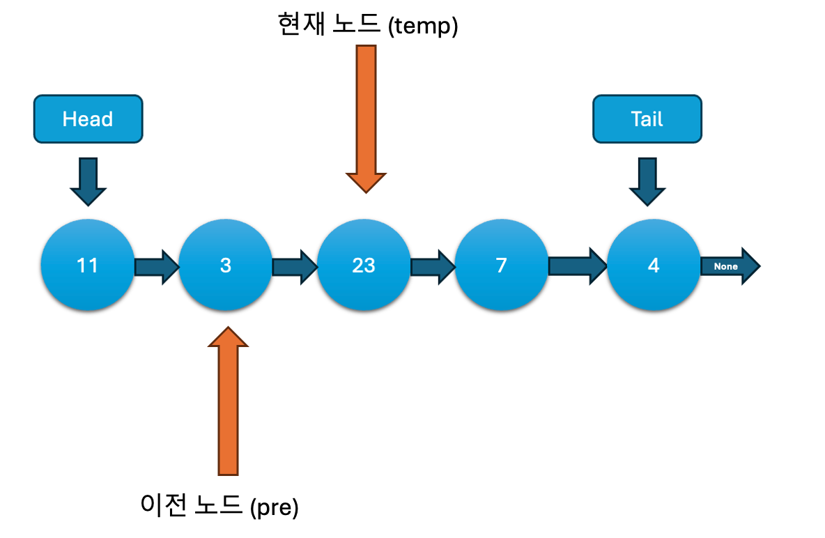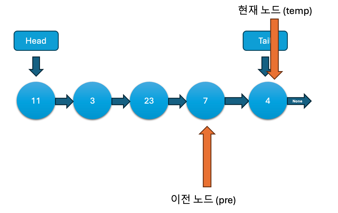 while문을 이용해 노드를 탐색합니다. temp.next가 None이 아닐 동안 계속 반복하여, temp는 현재 노드를, pre는 이전 노드를 가리킵니다. 결국 temp는 리스트의 마지막 노드를 가리키게 됩니다.