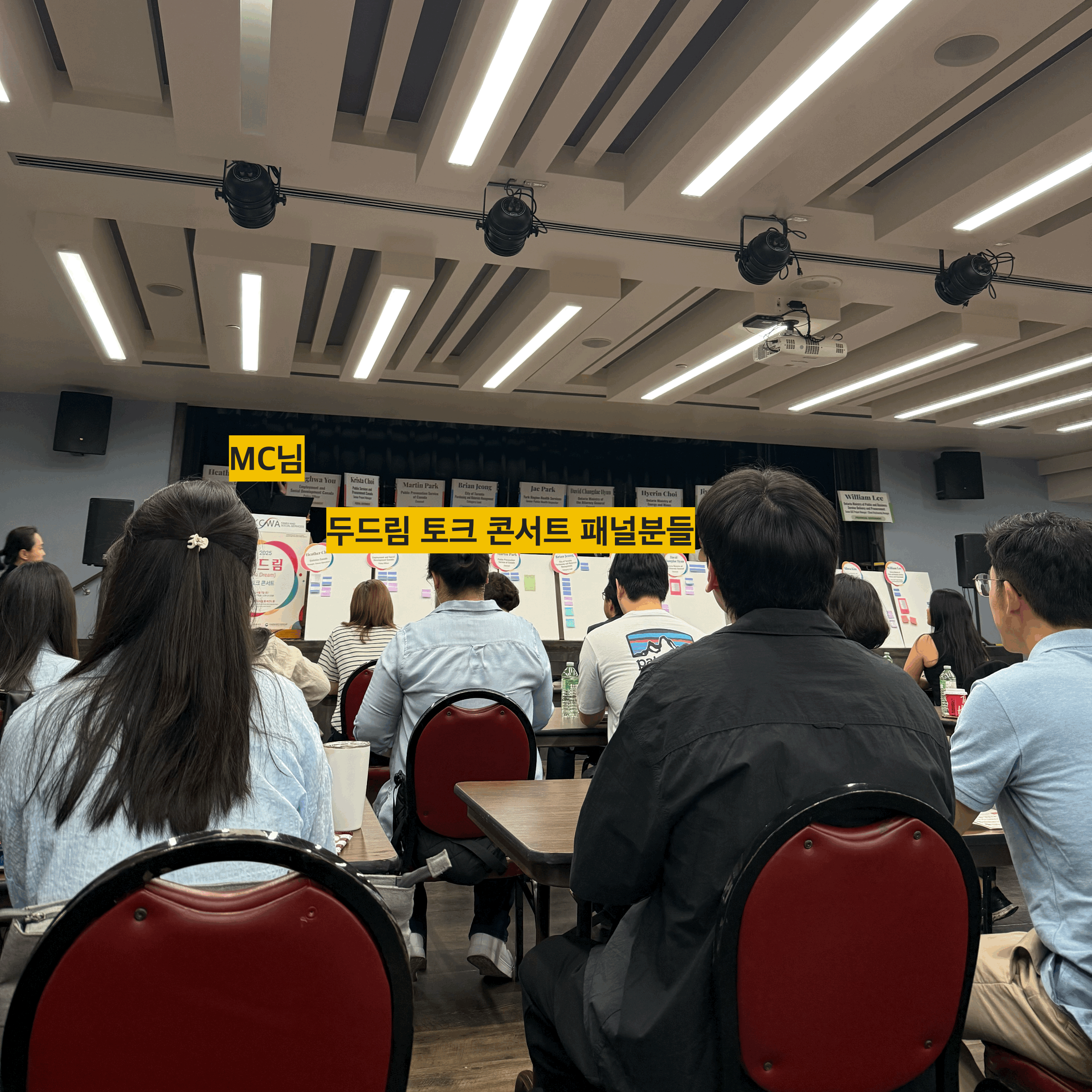 두드림 토크 콘서트는 North York Memorial Community Hall에서 진행됐습니다. 행사장에 도착해 등록 데스크에서 네임택을 받고, 입장 전 간단한 커피, 물, 간식도 제공되어 부담 없이 분위기를 익힐 수 있었습니다.