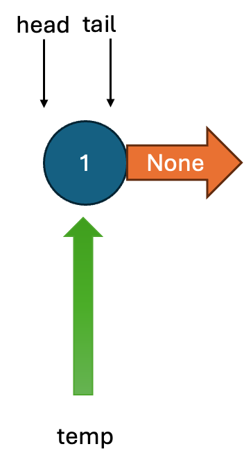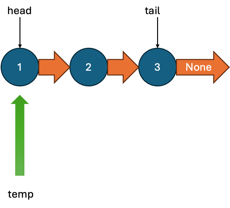 - temp 변수를 self.head로 초기화합니다. 즉, temp는 처음에 헤드 노드(값 1)를 가리킵니다.