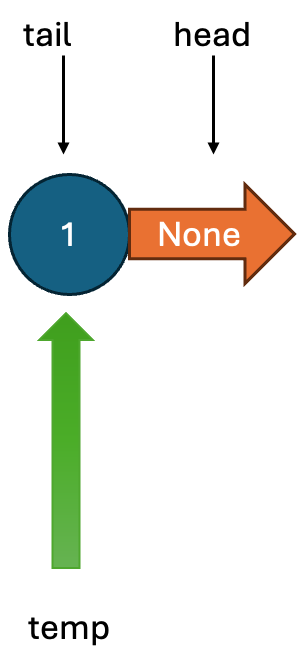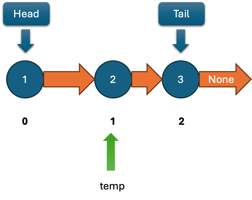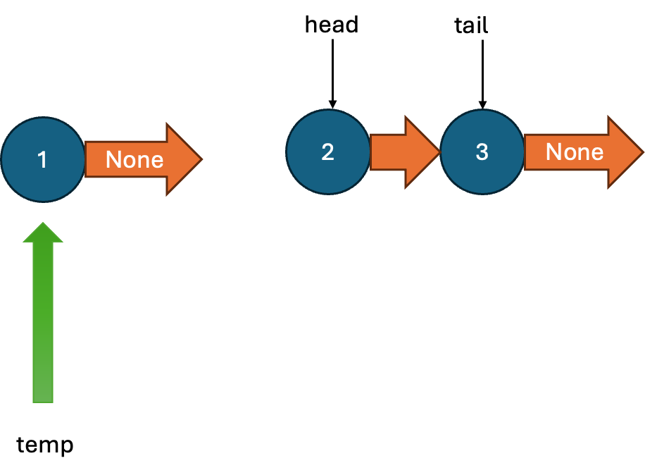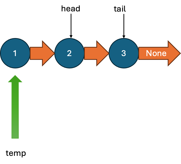 여기서 self.head는 1, self.tail은 3을 가리키고 있습니다. 먼저 self.head를 temp에 저장합니다.