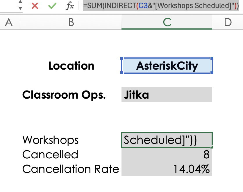 =SUM(INDIRECT(C3&"[Workshops Scheduled]"))