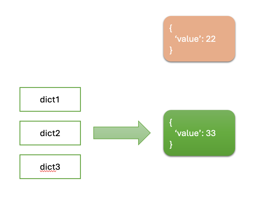 dict2가 dict3로 참조를 변경했기 때문에, dict1은 여전히 {'value': 22}을 유지하고, dict2는 이제 dict3과 동일한 값을 참조하게 됩니다.