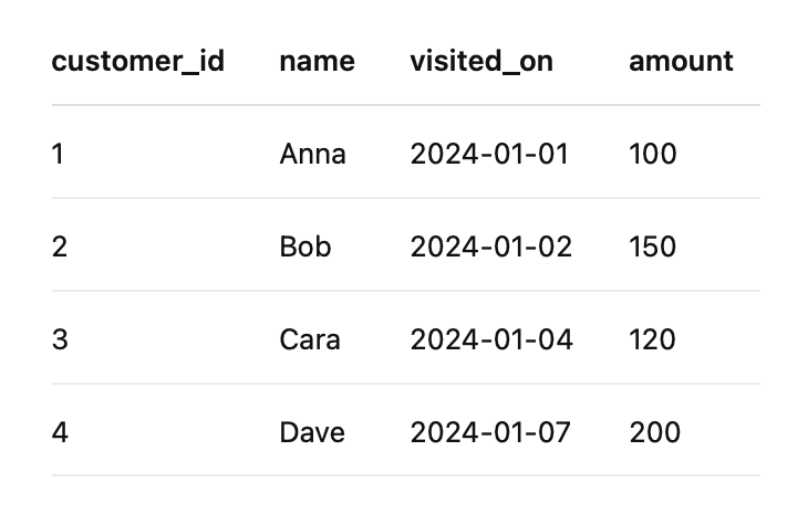 | customer_id | name | visited_on | amount |