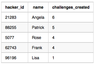 - 챌린지 수 기준 내림차순, 동률일 경우 hacker_id 오름차순으로 정렬합니다.