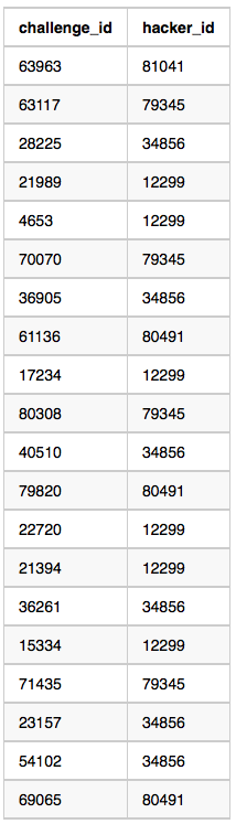 - Challenges: The challenge_id is the id of the challenge, and hacker_id is the id of the student who created the challenge.